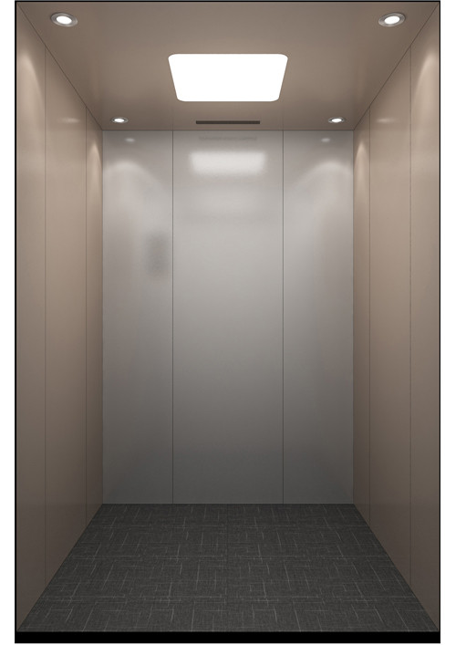 轎廂型號:YG-1623  天井:香檳砂紋板(YG-07)  兩側、后側板:兩側灰色砂紋噴涂鋼板(YG-01)+鏡面不銹鋼,后側麥點布紋彩紋鋼板(HK-03)+鏡面飾條  前側板、門楣:緞紋不銹鋼  轎門:緞紋不銹鋼  地板:FL-P32  操作盤:BD-D2F1